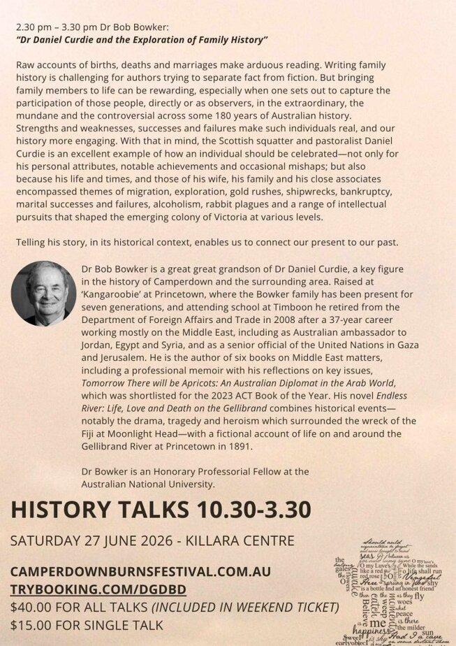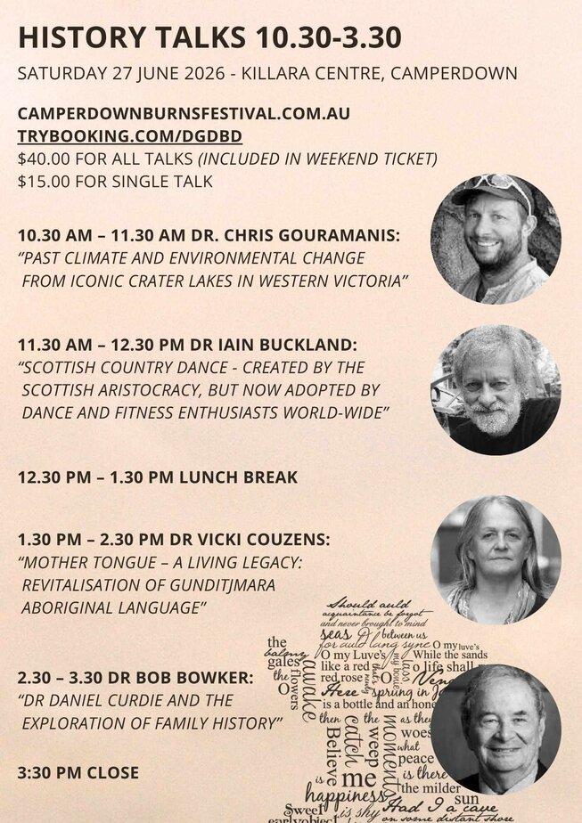 The Festival Committee are pleased to announce that the Festival Program is nearing completion and promises new elements along with a number of favourite events returning. The Festival Chairperson Dr John Menzies OAM said “the Committee is pleased to announce that Early Bird tickets are now available via the festival website: camperdownburnsfestival.com.au and through trybooking.com/DGDBD.