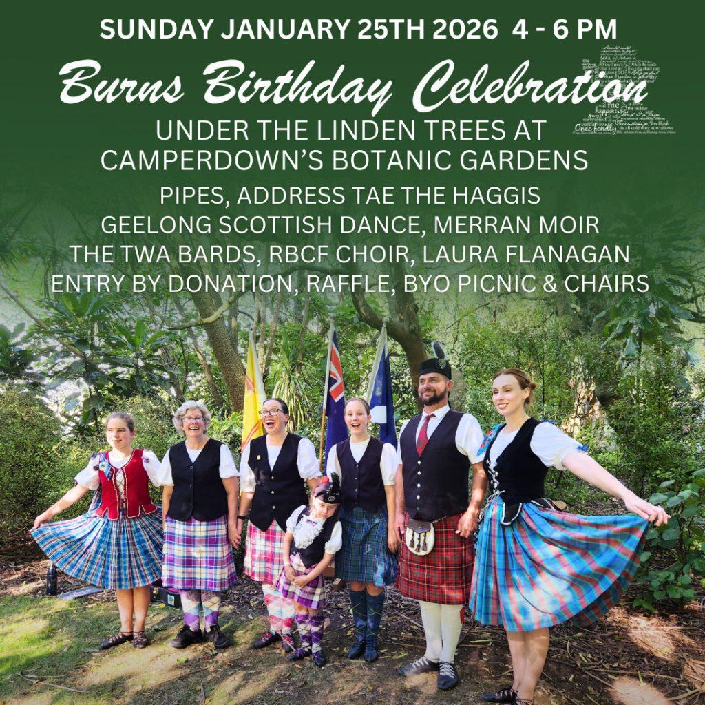The Robert Burns Celtic Festival Committee invite you to a relaxed, family friendly afternoon. The annual Robert Burns Birthday Celebrations are to be held at the Camperdown Botanic Gardens on Sunday the 25th of January, from 4-6pm.